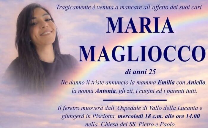 Profonda commozione a Pisciotta per i funerali di Maria Magliocco, la giovane di 24 anni deceduta nell’incidente stradale avvenuto venerdì scorso Montecorice, in cui ha perso la vita anche il fidanzato Michele Pirozzi. Nel primo pomeriggio la salma è giunta ...