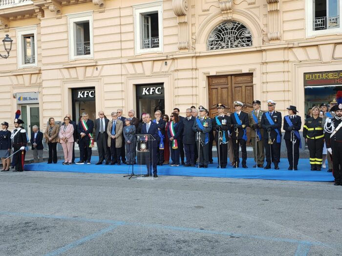 Dopo la deposizione delle corone d’alloro da parte del Prefetto, Francesco Esposito, insieme alle Autorità militari e civili, al Monumento ai Caduti in Piazza Vittorio Veneto la celebrazione si è svolta in Piazza Amendola dove il massimo rappresentante di governo ha ricevuto gli onori da parte di un reparto interforze, espressione dei Comandi del territorio.
