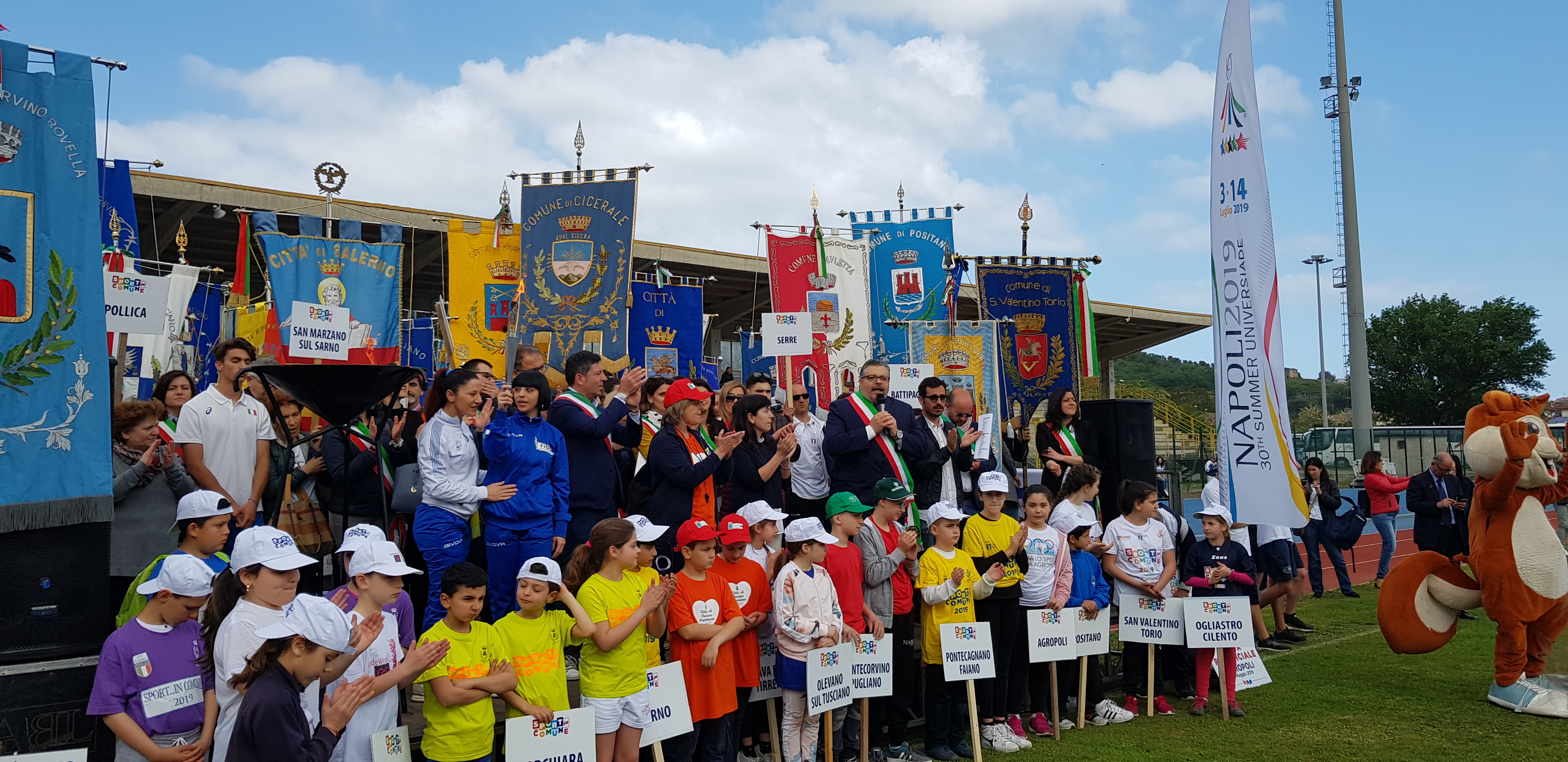 Oltre 1.500 bambini, provenienti da ogni parte della provincia di Salerno, hanno preso parte questa mattina alla Festa Provinciale di “Sport in… Comune”, che si è svolta presso l’impianto sportivo “R. Guariglia” di Agropoli. La manifestazione è stata organizzata dal CONI di Salerno, in collaborazione con la Feder Sanità ANCI, la Direzione Scolastica Regionale della Campania, l’AICS e con il patrocinio del Comune di Agropoli e del Comitato Organizzatore Universiadi di Napoli 2019. Oltre 66 le rappresentative, con alunni delle classi quarte e quinte delle scuole elementari che si sono cimentati in una serie di attività, con prove individuali e di squadra in una serie di sport che hanno incluso corsa, basket, pallavolo e tanto altro. La cerimonia di apertura ha visto sfilare i gonfaloni dei diversi Comuni partecipanti, con i rappresentanti istituzionali e i piccoli atleti. Questi si sono impegnati in prove di corsa veloce (30 metri); di lanci con la palla; lanci di forza. Poi il circuito multisport con 4 prove e la staffetta veloce mista (6 x 30 metri). Sono stati premiati i primi tre classificati di ogni prova, sia individuale che di squadra. Per il Comune di Agropoli, erano presenti, oltre al sindaco Adamo Coppola, gli assessori Vanna D’Arienzo, Rosa Lampasona e Roberto Mutalipassi; il consigliere delegato allo sport, Giuseppe Cammarota.