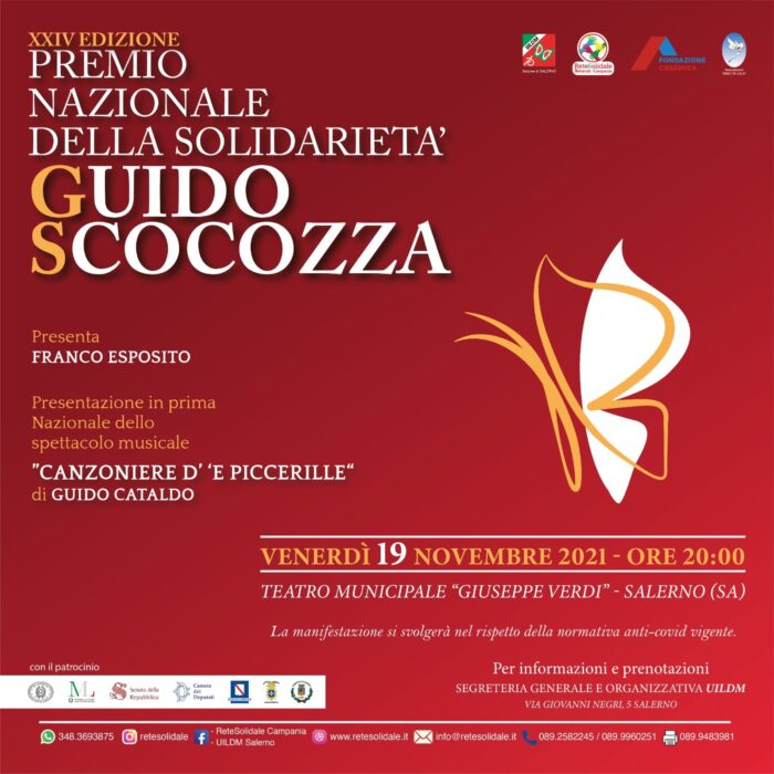 E saranno proprio questi valori ad essere i protagonisti della serata d’onore della XXIV Edizione che dal 1987 assegna riconoscimenti a persone che si sono distinte, a livello locale o nazionale, per il loro impegno sociale. La serata si concluderà con la presentazione in prima nazionale dello spettacolo musicale dal titolo “Canzoniere d’’e piccerille”, scritto dal Maestro Guido Cataldo, che ne ha curato anche la regia.