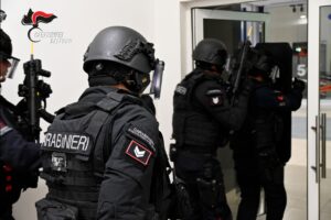 Napoli. L’esercitazione ha simulato che un personaggio di spicco della criminalità organizzata ditipo mafioso destinatario di un Ordine di Custodia Cautelare emesso dall’Autorità Giudiziaria di Salerno, unitamente a due fiancheggiatori, vengono intercettati da unapattuglia dei Carabinieri del Nucleo Investigativo mentre si dirigono al Centro Commerciale. Giunti all’interno uno dei tre viene tratto in arresto mentre i restanti tentano la fuga all’interno dello stabile. Dopo un primo intervento di cinturazione di terra e di ariamesso in atto dagli equipaggi della Sezione Radiomobile e dal 7 Nucleo Elicotteri,intervengono le squadre A.P.I. e S.O.S. che riescono nell’immediatezza ad intercettare ed arrestate uno dei fuggitivi. Il terzo componente nonché destinatario del provvedimento si barrica all’interno dei bagni in cui si trovava casualmente uno dei dipendenti del Centro Commerciale, che viene rilasciato grazie all’intervento dei Carabinieri Negoziatori. L’esercitazione si conclude con l’arresto del malavitoso e con il rinvenimento di uno zaino trasportato da quest’ultimo che determina l’intervento degli Artificieri Antisabotaggio. Lo scopo dell’esercitazione è verificare le capacità di risposta ad un’attivazione diemergenza a seguito di un intervento ad alto rischio in ambiente urbano.