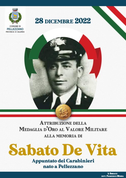 Anche il Comune di Pellezzano, nella persona del Sindaco Francesco Morra, parteciperà alla commemorazione dell’80esimo anniversario della morte dell’Appuntato Medaglia d’Oro al Valor Militare “alla memoria” Sabato De Vita, che si terrà, mercoledì 28 dicembre 2022, alle ore 9.00 presso la caserma della Stazione dei Carabinieri di Salerno Duomo.