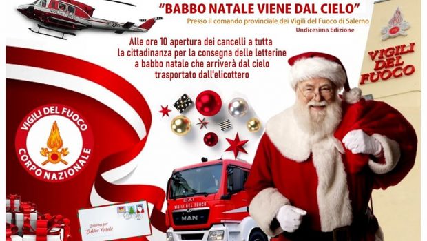 Si avvicina il giorno della consegna delle letterine a Babbo Natale ed il Comando dei Vigili del Fuoco di Salerno è pronto ad aprire i cancelli domenica 22 dicembre alle ore 10,00 per consentire a tutti i bambini di consegnare i loro desideri al nonnino vestito di rosso. Una giornata di festa per l’undicesima edizione che vedrà nei panni di Babbo Natale Pompiere arrivare dal cielo in elicottero per calarsi dal castello di manovra e di lì in cordata fino a raggiungere il suolo dove riceverà le letterine. La manifestazione interamente dedicata ai bambini si terrà presso il comando provinciale dei vigili del fuoco di Sant’Eustachio a Salerno dove per la mattinata è prevista la possibilità per i bambini di cimentarsi nel percorso del minipompiere allestito nel piazzale aspettando Babbo Natale.