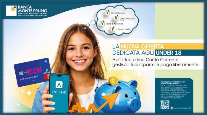 Con la nuova offerta dedicata agli under 18, la Banca Monte Pruno è pronta ad accompagnare ragazze e ragazzi nei primi passi verso l’autonomia economica, mettendo a disposizione strumenti semplici, sicuri e pensati per le loro esigenze quotidiane.