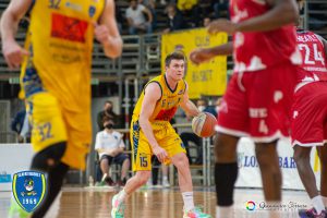 E’ una partita intensa, fatta di grande agonismo. Le iniziative dei singoli prendono il sopravvento sul gioco di squadra: situazione che però non favorisce i gialloblù, soprattutto perché gli arbitri preferiscono far giocare (20-23 al 13’). Rimesso in sesto dalle mani d’oro di Carmando, De Laurentiis ritorna in campo a dare manforte ai suoi, i quali, grazie alle buone scelte di tiro di Ambrosin e Mobio, mettono la freccia al 14’ (24-23). La sfida diventa un botta e risposta da una parte e dall’altra e sale di intensità, ritmo ed agonismo (29-29 al 15’). Poi il folletto Johnson sale in cattedra e permette ai suoi di allungare nuovamente 29-35 al 18’. Nel finale sono però i padroni di casa ad avere più cartucce da sparare, chiudendo avanti 39-37 la prima parte della gara.