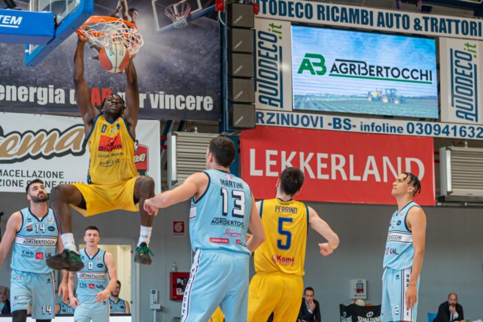 Janelidze è l’ultimo baluardo di casa (59-74 al 32’), poi Mobio e Parravicini vanno a segno con continuità, portando il punteggio sul 65-87 al 38’, che di fatto chiude anzitempo la contesa. Negli ultimi minuti, entrambi i tecnici danno spazio agli uomini della panchina in una partita che ha poco altro da raccontare e che si chiude col punteggio finale di 70-89.