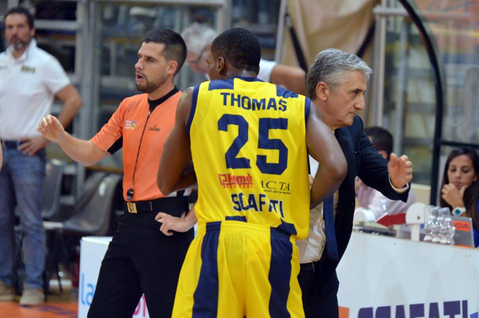 sull’acceleratore nella seconda parte, mollando la presa solo a risultato praticamente acquisito, dopo aver raggiunto un buon margine di vantaggio. Cinque punti consecutivi di Tommasini battezzano positivamente la sfida dei padroni di casa (5-0 al 2’). La Remer reagisce subito, gioca di squadra, trova con D’Almeida il canestro del pareggio (9-9 al 5’) e con Olasewere quello del sorpasso (12-13 al 7’). I subentri di Contento, Romeo ed Ammannato non cambiano l’andazzo della sfida che resta in equilibrio (15-15 al 8’). Ma, nel finale, i padroni di casa riescono a recuperare qualche possesso e a trovare con maggiore lucidità la via del canestro, chiudendo avanti 28-20 la prima frazione. Coach Calvani prova a sorprendere l’avversario, alzando i centimetri del quintetto ed inserendo Sgobba da ala piccola, con Ammannato e Goodwin sotto le plance. Ma i bergamaschi rispondono per le rime, si dispongono a zona in difesa e in attacco trovano i canestri (bene Palumbo) che valgono prima il pareggio (30-30 al 14’) e poi il sorpasso (31-33 al 15’; 31-35 al 16’). L’allenatore gialloblù chiede time-out e prova a strigliare i suoi, facendo riposare Sgobba e alleggerendo il settore esterni. Thomas fa quel che può, ristabilisce da solo le distanze (37-37 al 17’) e poi, con l’ausilio di Ammannato, riporta avanti la Givova (39-37 al 18’), che riesce a raggiungere l’intervallo in vantaggio 43-41. Dopo una prima fase caratterizzata da botta e risposta da una parte e dall’altra, alla ripresa delle ostilità la truppa di casa prova ad aggredire in difesa e ad accelerare in attacco, trovando così un buon vantaggio (55-46 al 25’). Coach Vertemati ferma il cronometro, ma ciononostante Scafati conserva il pallino del gioco e, col trascorrere dei minuti, aumenta il proprio vantaggio, fino a chiudere avanti 65-50 il terzo periodo. L’ultimo quarto inizia sulla falsariga del precedente: Scafati continua a fare la voce grossa con personalità ed autorevolezza, raggiungendo, grazie alla vena realizzativa di Thomas, un vantaggio considerevole (73-50 al 31’). La partita è praticamente in ghiaccio, ma i gialloblù riescono a complicarsi la vita, facendo fatica a superare la dive a zona ospite e subendo l’iniziativa di Caroti e compagni, che iniziano a crivellare la retina dalla distanza con continuità, riducendo drasticamente il vantaggio (82-70 al 38’). Ma azzerare il copioso margine di vantaggio locale è praticamente impossibile, così la prima vittoria in casa arriva con il risultato finale di 87-72. Dichiarazione di coach Marco Calvani: «Devo fare i complimenti alla società di Treviglio, perché non era facile affrontare la sfida nelle condizioni in cui si è trovata, ovvero senza atleti importanti come Frassineti e Roberts. Ha combattuto fino alla fine, proprio come aveva già fatto la scorsa settimana a Capo D’Orlando, perdendo dopo un supplementare. Gli va riconosciuto quanto di buono ha fatto vedere in campo. Noi invece siamo andati un po’ a fiammate: nel primo quarto bene; nel secondo abbiamo sbagliato parecchi tiri da tre aperti; nella ripresa, trovando il canestro dalla lunga distanza, tutto è sembrato filare liscio, anche perché gli avversari hanno iniziato a segnare con più basse percentuali da dentro l’area, pur trovando invece il modo di restare aggrappati alla sfida con buone percentuali da tre punti. Ancora non siamo tutti connessi in maniera costante, c’è necessità di mettere in ordine certe cose e farlo in fretta, perché il campionato avanza e questa partita deve servirci per capire su cosa dobbiamo ancora lavorare, anche se la qualità del lavoro settimanale mi fa essere fiducioso sui tempi di risoluzione di tali problematici aspetti».