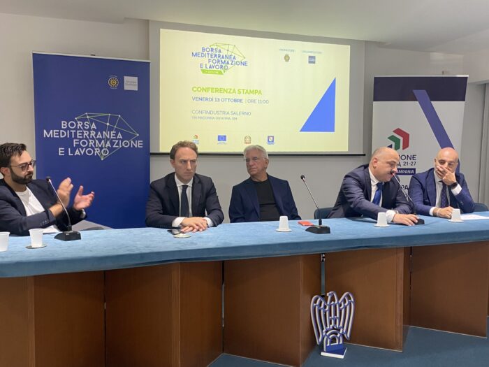 Dal 19 al 21 ottobre Salerno ospita la tappa conclusiva della Borsa Mediterranea Formazione e Lavoro, in programma al Teatro Augusteo. tutto il programma è stato presentato in una conferenza stampa stamattina presso Confindustria Salerno, con la partecipazione del sindaco di Salerno, Vincenzo Napoli e gli interventi di Giovanni D’Avenia, Presidente Centro Studi Super Sud, e Antonio Vitolo, CEO e Founder di Gruppo Stratego. L’incontro si è concluso con l’intervento del deputato Piero De Luca. L’iniziativa sarà una tre giorni all’insegna della promozione e della valorizzazione dei percorsi di formazione e inserimento lavorativo attivi in Campania e della valorizzazione delle buone pratiche aziendali relativamente al capitale umano e chiuderà il format itinerante della Borsa, che ha toccato le città di Napoli, con oltre 1000 presenze tra visitatori e studenti, Benevento, Avellino e Caserta. La Borsa Mediterranea della Formazione e del Lavoro, promossa dal Centro Studi Super Sud e organizzata da Gruppo Stratego, anche quest’anno registra la partnership con la Regione Campania e rappresenta l’occasione per presentare le attività e le misure promosse dalla Regione con il supporto del Fondo Sociale Europeo Plus, in particolare sui temi della formazione e del lavoro. La Borsa ha l’obiettivo di agevolare il matching tra domanda e offerta di lavoro e fornire agli studenti delle scuole superiori e delle università e ai NEET utili strumenti per l’orientamento e la crescita professionale e opportunità di inserimento lavorativo.