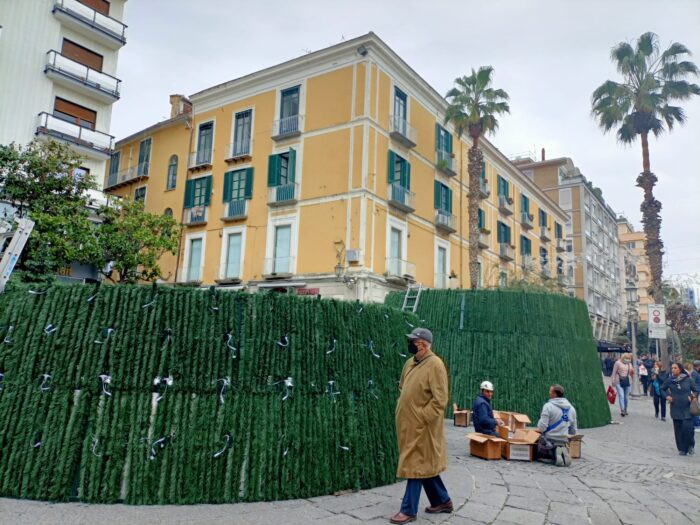 Prosegue in Piazza Portanova la costruzione del mega albero, alto 21 metri, che,  con molta probabilità, verrà acceso già venerdì 3 dicembre, la data entro la quale l’amministrazione comunale di Salerno punta ad avviare anche le installazioni luminose di luci d’artista.
