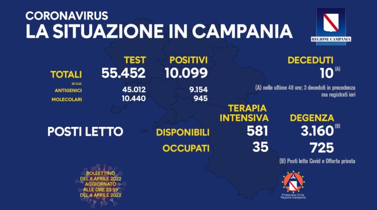 Sono 10.099 i nuovi positivi al Covid in Campania, su 55.452 test esaminati. Il tasso di incidenza sale al 18,21% (ieri 16,93). Tredici le nuove vittime, di cui dieci nelle ultime 48 ore e tre risalenti ai giorni precedenti. Invariata l’occupazione dei posti letto nelle intensive, a quota 35, mentre quella delle degenze cala a […]