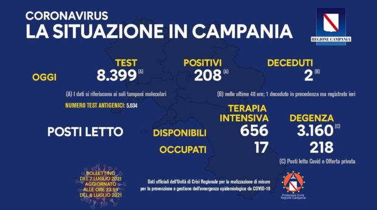 Torna a rialzarsi, in Campania, l’indice di contagio. Secondo i dati dell’Unità di crisi della Regione Campania, nelle ultime 24 ore sono 208 i casi positivi al Covid su 8.399 tamponi molecolari esaminati. Se ieri il tasso di contagio era pari all’1,83%, oggi è pari a 2,47%. Due i decessi, uno deceduto in precedenza ma […]