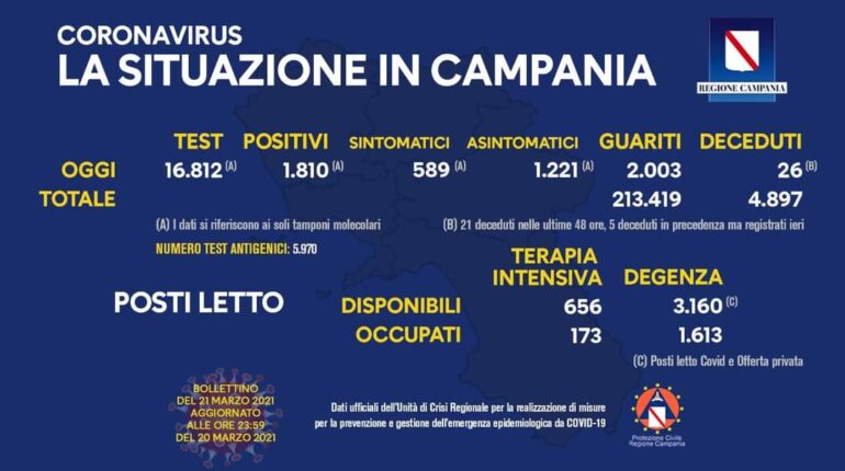 Resta stabile, in Campania, la curva dei contagi. Secondo i dati dell’Unità di crisi della Regione Campania, nelle ultime 24 ore sono 1.810 i positivi su 16.812 tamponi molecolari esaminati. Ieri il tasso di incidenza era pari al 10,49%, oggi è del 10,76%.Diminuisce il bilancio del morti, ieri 28 e oggi 26, mentre aumenta il […]