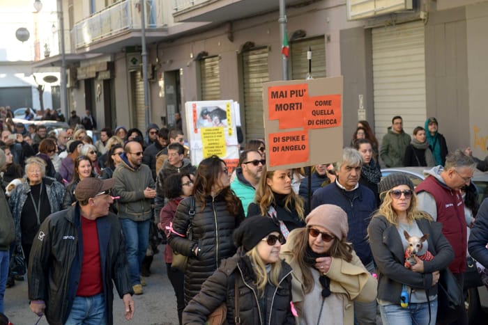 Centinaia di persone hanno partecipato questa mattina al corteo organizzato a Pastena dalle associazioni animaliste di Salerno per chiedere giustizia per Chicca, il cucciolo di cane di pochi mesi barbaramente ucciso pochi giorni fa a calci dal suo padrone. “Abbiamo aderito con convinzione a questa manifestazione – riferiscono il consigliere regionale del Sole che Ride Francesco Emilio Borrelli e l’assessore comunale dei Davvero Verdi Mariarita Giordano – e ci costituiremo come parte civile nel processo. Il continuo massacro e le violenze contro gli animali in Campania aumentano ogni giorno di più. In particolare gli uomini violenti e cattivi si sfogano con sempre maggiore rabbia contro i più deboli anche senza alcuna ragione. In particolare le vittime predilette sono i bambini, gli animali e le donne. Nel 2016 ci sono stati circa 1500 casi di tortura nella sola Campania. Numeri inaccettabili. Chi commette violenza contro gli animali nella gran parte dei casi non esita a fare lo stesso verso i bambini e le donne”.