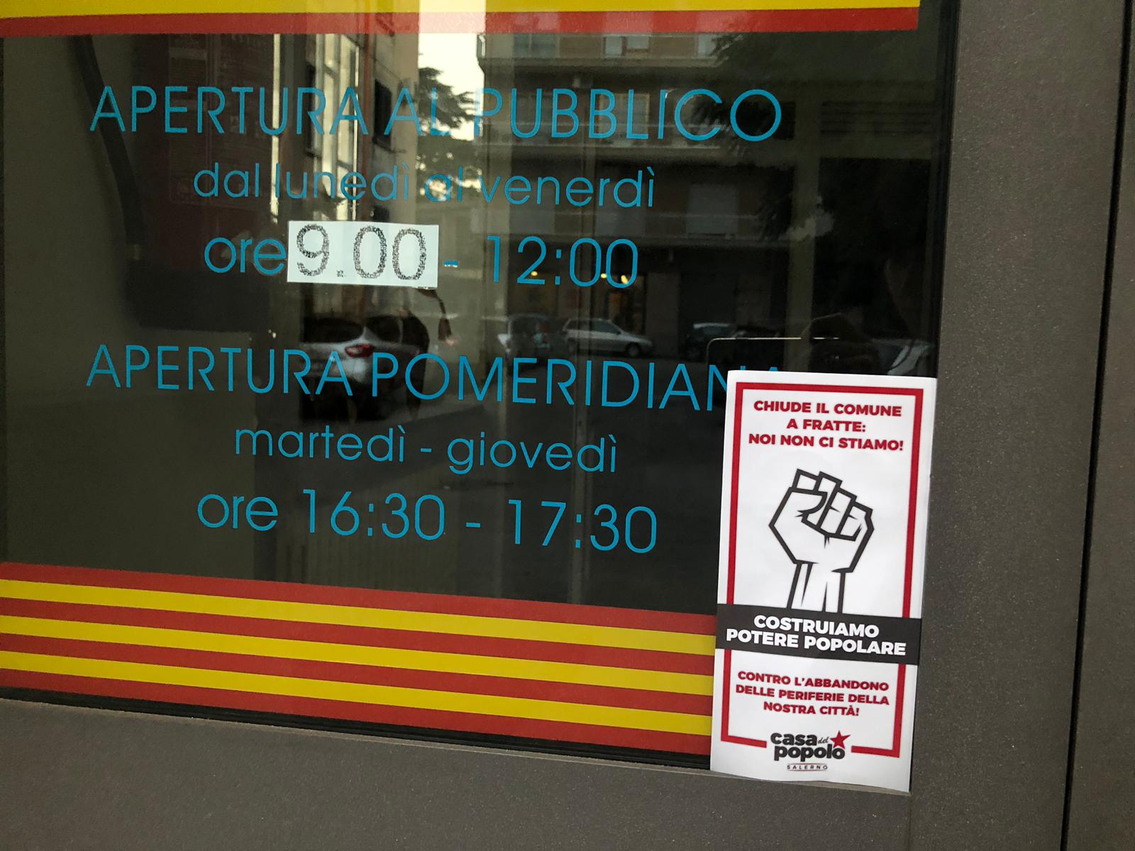 Ad intervenire è Daniele Procida della casa del popolo che afferma: “Purtroppo sempre più spesso i cittadini, non solo a Fratte, vedono sottrarsi dei servizi. Soppressione di linee di trasporto, estinzione di sedi delle ASL, riduzione di prestazioni mediche e, ovviamente, chiusura di Uffici Pubblici. Le Amministrazioni Locali rispondono sempre alla stessa maniera: “Non ci sono i soldi”. Ed in alcuni casi è vero. Ricordiamo infatti che l’Italia è soggetta all’Austerità imposta dall’Unione Europea con la famosa lettera “Trichet-Draghi” del 2011”. Il militante di Potere al popolo Salerno aggiunge inoltre “A fronte di tutto questo però, tornando al Comune di Salerno, i soldi che non mancano mai sono quelli per Luci d’Artista, per le speculazioni edilizie (il Crescent ed il tunnel che dovrebbe collegare Canalone al porto) e soprattutto per gli onerosi stipendi dei consigli d’amministrazione delle partecipate del Comune. Per questo motivo chiediamo la riapertura degli uffici chiusi e siamo pronti a lottare, tra le persone e insieme a loro, per riconquistare un servizio fondamentale per tutte e tutti. Non vogliamo pagare i tagli dei diritti “.