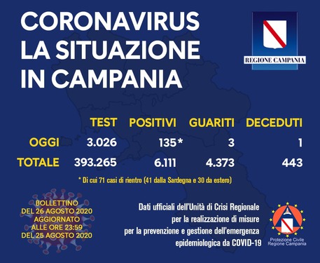 Centotrentacinque positivi di cui 71 casi di rientro (41 dalla Sardegna e 30 dall’estero) su 3.026 tamponi: questi i dati del bollettino di oggi dell’Unità di crisi della Regione Campania riferito alle ultime 24 ore. Il totale dei positivi è di 6.111 unità mentre il totale dei tamponi è di 393.265. Una persona è deceduta; i guariti sono 3.