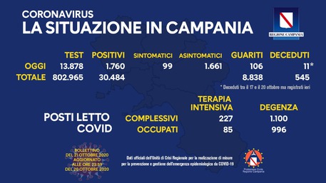 Forte balzo in avanti dei contagi in Campania. Nelle ultime 24 ore sono stati 1.760 rispetto ai 1.312 di ieri. I tamponi effettuati sono stati 13.878 contro i precedenti 10.205. I morti sono 11, deceduti tra il 17 ed il 20 ottobre ma registrati nella giornata di ieri. Sul totale dei 1.760 positivi, 99 sono sintomatici e 1.661 asintomatici. Il totale dei positivi in Campania dall’inizio dell’emergenza è ora di 30.484 mentre i tamponi effettuati sono stati 802.965.