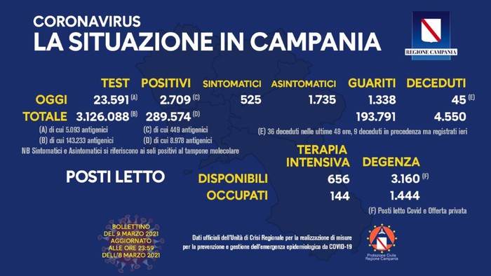 Ben 45 le vittime, di cui 36 decedute nelle ultime 48 ore e 9 nei giorni precedenti. Sul fronte degli ospedali i posti letto di terapia intensiva occupati sono 144 (-4 rispetto al giorno precedente) e quelli di degenza 1.444 (+19).