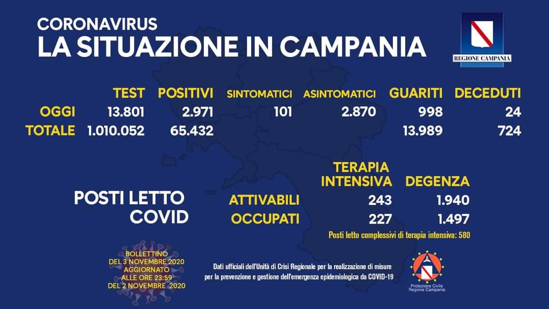 Secondo i dati dell’Unità di crisi, aggiornati alla mezzanotte scorsa, i nuovi positivi sono stati 2.971 (di cui 101 sintomatici) su 13.801 tamponi. Ventiquattro le nuove vittime.