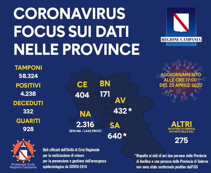 Il totale dei positivi è di 4.238 su 58.324 tamponi. Quello dei deceduti sale a 332, quello dei guariti a 928, di 855 totalmente guariti e 73 clinicamente guariti, in attesa dei due tamponi consecutivi finali.