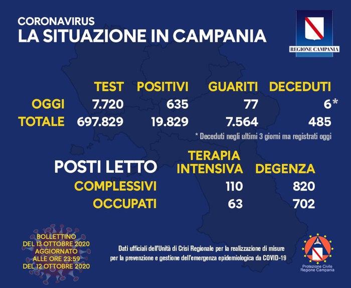 Sono 635 le persone risultate positive al Coronavirus in Campania nelle ultime 24 ore su un totale di 7720 tamponi esaminati. Lo rende noto l’Unità di crisi della Regione Campania. Ad oggi il totale delle persone positive è di 19.827 su un totale di 697.829 tamponi.