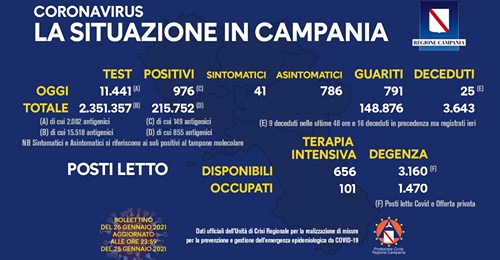 Secondo i dati dell’Unità di crisi della Regione Campania, nelle ultime 24 ore i positivi sono 976, di cui 41 sintomatici.