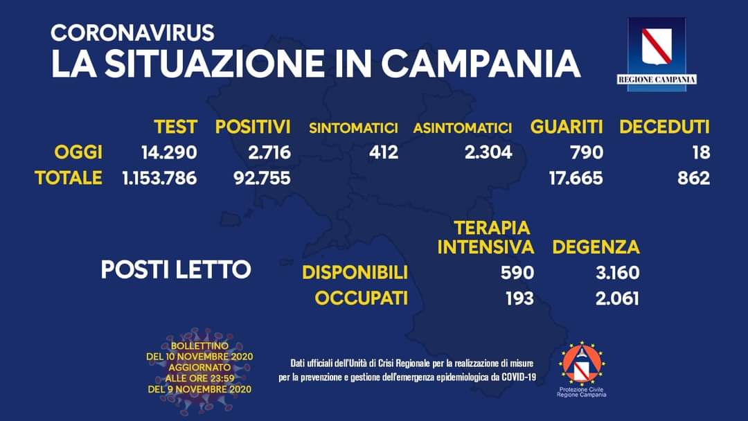 Sono 2716 i pazienti risultati positivi nelle ultime 24 ore al Covide 19 in Campania. Gli asintomatici: 2304 mentre i Sintomatici 412 a fronte di 14290 tamponi che sono stati esaminati nelle diverse strutture.