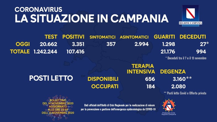 I deceduti, tra il 7 ed il 13 novembre, sono 27. I guariti del sono 1.298. Questi i dati del bollettino dell’Unità di Crisi regionale. Il report dei posti letto su base regionale indica in 656 quelli di terapia intensiva disponibili (184 occupati), in 3.160 (covid e offerta privata) i posti letto di degenza disponibili: (occupati 2.080).