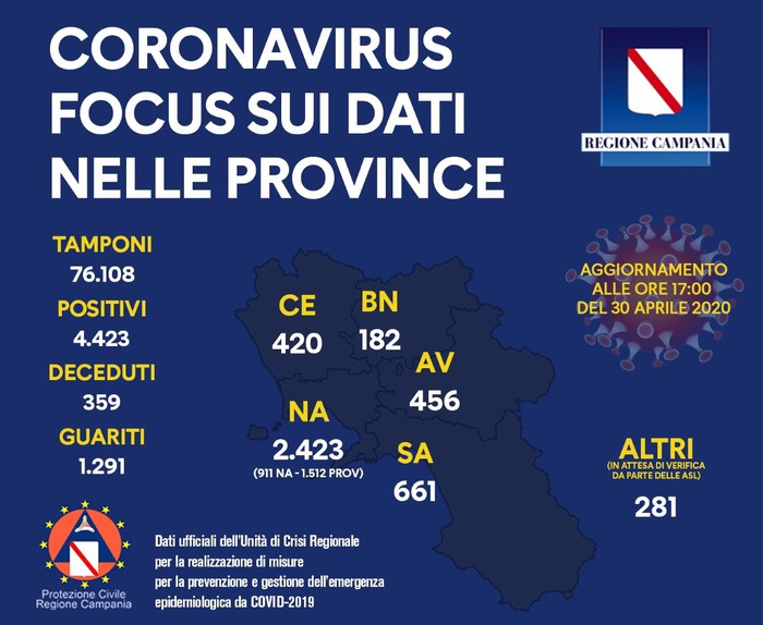 Ventidue i nuovi guariti (totale 1.291). Il totale dei positivi aggiornato a ieri è di 4.423 su 76.108 tamponi eseguiti.