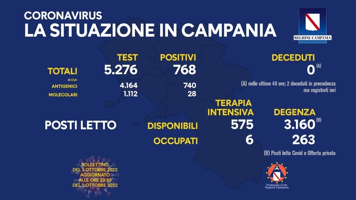 Sono 768 i positivi di oggi al Covid in Campania sui 5276 test effettuati per un indice di positività pari al 14,55%, in calo rispetto al 16,8% fatto segnare ieri.