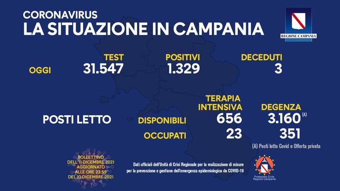 Nelle ultime 24 ore, secondo i dati del bollettino dell’Unità di crisi regionale, sono 1.329 i casi positivi al Covid su 31.547 test esaminati.