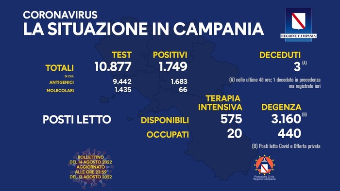 Sono 1749, in Campania, i neo positivi al Covid su 10877 test esaminati.