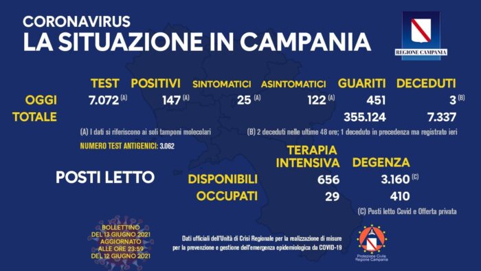 Resta stabile, in Campania, l’indice di positività. Nelle ultime 24 ore, secondo i dati dell’Unità di crisi della regione Campania, sono 147 i casi positivi al Covid su 7072 tamponi molecolari esaminati.