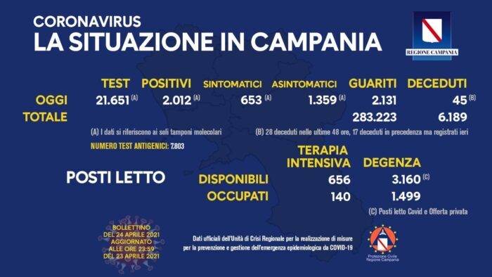 Sono 2.012 i positivi del giorno in Campania – di cui 1359 asintomatici e 653 sintomatici – come emerge dal bollettino dell’unità di crisi della Regione. I tamponi molecolari effettuati sono stati 21.615.