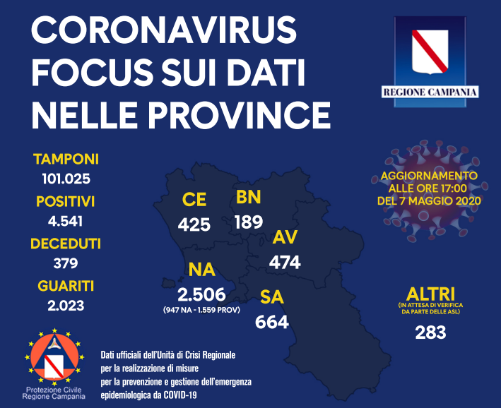 Alle ore 23.59 di ieri, come rende noto l’Unità di Crisi della Regione Campania, i pazienti positivi in Campania erano 4541 a fronte di 101205 tamponi effettuati. Le persone decedute sono 379 a fronte 2.023 guariti (di cui 1759 totalmente guariti e 264 clinicamente guariti.