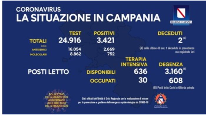 Sono 3.421 i nuovi positivi al Covid in Campania, su 24.916 test esaminati.