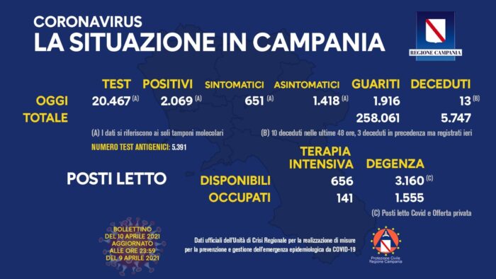 Secondo i dati dell’Unità di crisi della Regione Campania, sono 2.069 (651 sintomatici) i casi positivi nelle ultime 24 ore su 20.647 tamponi molecolari esaminati..