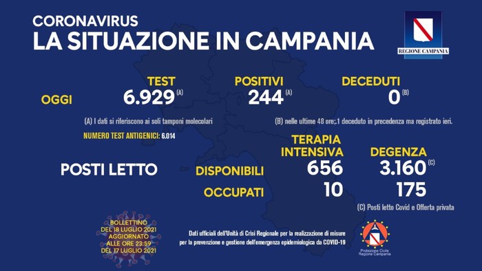 Sono 244 in Campania i casi positivi al Covid su 6.929 tamponi molecolari esaminati. Sale ancora, dunque, l’indice di contagio che oggi è pari al 3,52% rispetto al 3,09% precedente.