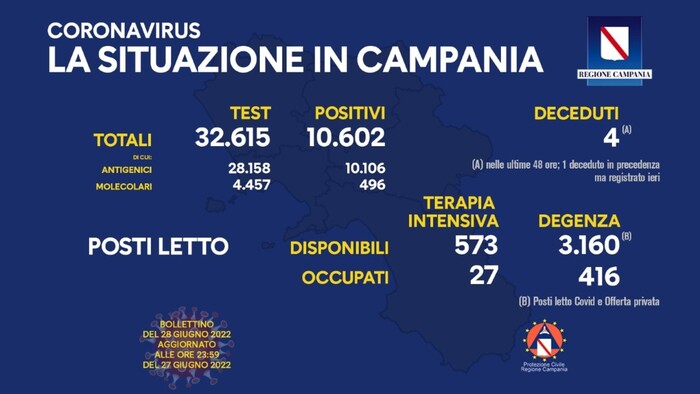 Sono 10.602 i positivi del giorno al Covid in Campania – sui 32.615 test effettuati – per un indice di contagio che continua a crescere e si attesta al 32,5% (ieri si era fermato al 31,7%).