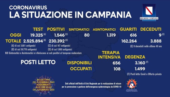 E’ in calo la curva dei contagi in Campania. Secondo i dati delle ultime 24 ore dell’Unità di Crisi regionale i positivi sono 1.546 (di cui 147 casi identificati da test antigenici rapidi) e 80 sono sintomatici, su 19.325 tamponi effettuati (3001 antigenici).
