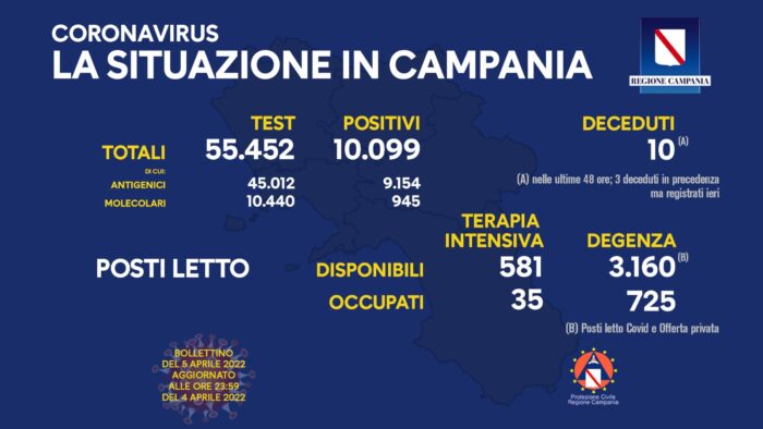 Sono 10.099 i nuovi positivi al Covid in Campania, su 55.452 test esaminati.