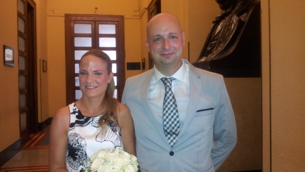 Salerno meglio della Svizzera. Deve essere quello che hanno pensato due fidanzati che hanno scelto la città per il loro si. Lui, Sandro Nicotera, un distinto ed simpatico pubblicitario svizzero, che vive a Zurigo, con chiare origini calabresi, lei Miriam Kneip una bella ed elegante ragazza tedesca, in un abito da cocktail party : che ci fanno tra bouquet e sorrisi a palazzo di città a salerno hanno chiesto in molti vedendo la coppia arrivare sotto i portici del Comune? Hanno infatti deciso di sposarsi qui scegliendo la sede dell’amministrazione comunale di Salerno per pronunciare il lro fatidico sì. Atmosfera internazionale insomma per il matrimonio celebrato stamani nel Municipio di Salerno, dove la felice coppia è stata circondata da un caloroso gruppo di familiari e amici, di provenienze diverse. Tanta emozione, ma soprattutto amore quello che la coppia sprigionava non solo tra di loro , ma anche verso la città di salerno scelta come il luogo che non potranno mai dimenticare.