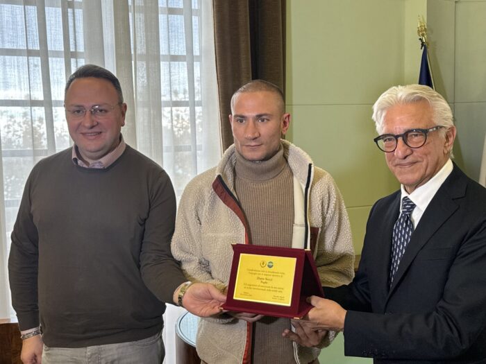 SA come la targa di Salerno, tatuata sul collo ma anche nel cuore del pugile campione del mondo, Dario Socci che sale sui ring internazionali “representing Salerno” con lui stesso con emozione ha ricordato questa mattina in una chiacchierata con il sindaco di Salerno, Vincenzo Napoli che gli ha consegnato una targa proprio per suggellare questo legame e la gratitudine che la città gli riserva. Con la speranza di poter realizzare un suo sogno nel …punchball (più che nel cassetto): organizzare quanto già realizzato nel Comune di Pellezzano, ovvero un incontro in una grande piazza, magari proprio Piazza della Libertà. A Pellezzano con il sindaco Francesco Morra, presente alla cerimonia che si è svolta nella stanza del primo cittadino di Salerno, l’evento si farà in primavera e Dario Socci ha voluto che l’ingresso sia gratis per i ragazzi con meno di 15 anni, perché vuole diffondere questa pratica sportiva a volte considerata violenta mentre può essere un percorso proprio per i ragazzi che come lui, nato a Fisciano, possono aver avuto momenti difficili nella vita da affrontare. Il suo prossimo incontro sarà in Thailandia, dove fuggirà delle vacanze natalizie, dove come ammette candidamente, fuggirà per non cadere nelle tentazioni della tavola natalizia.