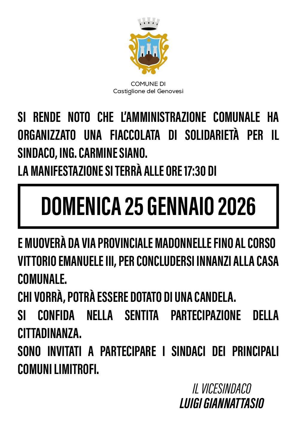 DOMENICA 25 GENNAIO FIACCOLATA PER IL SINDACO DI CASTIGLIONE DEL GENOVESI