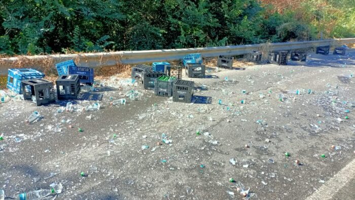 Un camion che trasportava casse di acqua in bottiglia di vetro , ha improvvisamente perso il carico e le bottiglie si sono inevitabilmente frantumate sulla rete stradale. tante le casse finite sulla carreggiata, con gli inevitabili problemi causati soprattutto dai vetri rimasti sulla sede stradale.