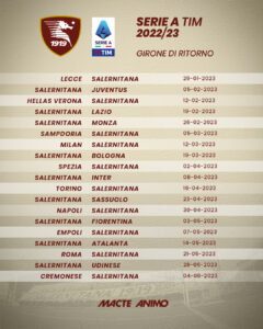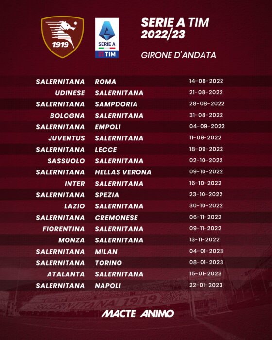 debutterà tra le mura amiche di nuovo contro i giallorossi, ma si tratterà della prima di campionato. Alla seconda giornata i granata ritroveranno l’Udinese, poi Samp in casa, Bologna fuori nel primo turno infrasettimanale previsto. Alla quinta la gara interna con l’Empoli, poi la trasferta in casa della Juventus. Prima della pausa per le nazionali, la Salernitana ospiterà il Lecce. Alla ripresa, trasferta sul campo del Sassuolo, poi Verona in casa, Inter in trasferta. Spezia in casa e Lazio fuori per chiudere ottobre. A novembre, si parte con la gara interna con la Cremonese. Poi turno infrasettimanale a Firenze e trasferta a Monza per l’ultima gara prima della pausa per i Mondiali del Qatar. Tutti in campo all’inizio del nuovo anno con Salernitana – Milan, poi turno infrasettimanale col Toro in casa, trasferta a Bergamo e chiusura con il derby interno con il Napoli il 22 gennaio. Alla prima di ritorno la Salernitana sarà di scena a Lecce, per poi ospitare la Juventus alla seconda. Alla terza trasferta a Verona, poi la Lazio all’Arechi e di seguito il Monza. Trasferta a Marassi con la Samp ed in casa del Milan per aprire marzo, prima del match interno col Bologna. Aprile si aprirà a La Spezia e poi in casa con l’Inter, prima del match in casa del Toro. Sassuolo in casa, prima del derby di ritorno col Napoli a fine aprile alla trentaduesima giornata. A maggio si comincerà con la gara interna con la Fiorentina. Empoli in trasferta, Atalanta in casa, Roma all’Olimpico, Udinese in casa ed all’ultima la trasferta di Cremona. Questo il cammino della Salernitana nel suo quarto campionato di massima serie. Per la prima volta nella sua storia la società granata sarà ai nastri di partenza della serie A per la seconda stagione di fila e, se non c’è due senza tre, bisognerà fare di tutto per centrare la salvezza, magari con meno sofferenza rispetto alla incredibile stagione passata.