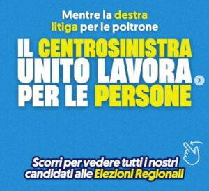 Il centrosinistra è unito per vincere in tutte le Regioni al voto. Per le persone” e la prima immagine si apre con la scritta “mentre la destra litiga per le poltrone”.