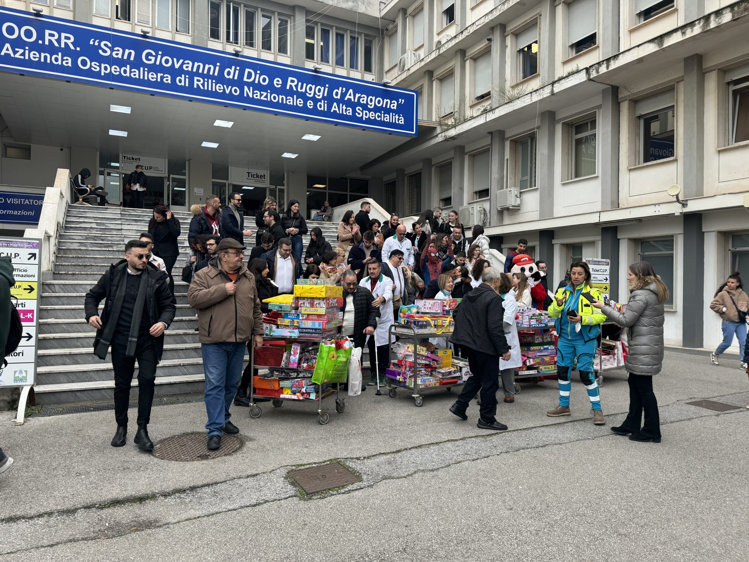 Quattro carrelli carichi di giocattoli per bimbi di ogni età: è la maxi calza della Befana raccolta da Donation, la sigla che racchiude 60 associazioni provenienti da tutta la provincia di Salerno ma anche da altri centri della regione Campania che si sono date appuntamento alle 11 all’azienda ospedaliera universitaria Ruggi d’Aragona di Salerno per consegnare i regali ai piccoli degenti ricoverati nel reparto di pediatria e chirurgia pediatrica dell’ospedale di Salerno. “Ringrazio le tantissime persone che hanno accolto il nostro invito a donare dei giocattoli per regalare un piccolo sorriso ai bimbi ricoverati e malati “ha dichiarato Luigi Bisogno, rappresentante di Donation. Una consegna che ha visto impegnati anche i volontari dell’Avo e  nel reparto è stata accolta da tanti sorrisi per i piccoli pazienti che dovranno trascorrere qui la notte più amata dai bimbi, in attesa della Befana.