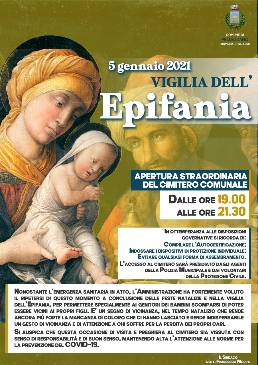 A differenza dello scorso anno, l’apertura straordinaria del Cimitero Comunale nella sera della vigilia dell’Epifania, ci sarà dalle ore 19.00 alle ore 21.30 (e non fino a mezzanotte come nei due anni precedenti), e per evitare assembramenti non verrà celebrata la Santa Messa, ma verrà installato un impianto di filodiffusione che accompagnerà la preghiera con musiche e canti Natalizi. Occasione questa, per ricordare anche l’adorazione dei Re Magi presso la capanna di Gesù Bambino in una notte che si preannuncia speciale e carica di significato. Alle 20.00 ci sarà la Santa Messa Solenne officiata nella Cappella del Cimitero dai Parroci delle Parrocchie del Comune di Pellezzano.