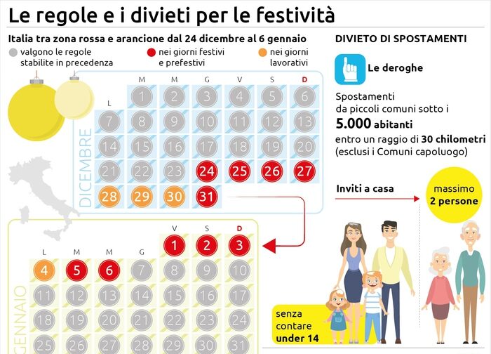 “Ragioniamo per una zona rossa nel periodo dal 24 dicembre al 6 gennaio nei giorni festivi e prefestivi. Si esce di casa solo per ragioni di lavoro, necessità e salute. E’ possibile ricevere nella propria abitazione fino a 2 persone non conviventi con eventualmente i propri figli minori di 14 anni. E’ una misura che abbiamo pensato per consentire quel minimo di socialità che si addice a questo periodo”. Lo dice il premier Giuseppe Conte in conferenza stampa da Palazzo Chigi. “Siamo al fianco” degli operatori che saranno coinvolti da queste misure. “Abbiamo sospeso contributi e tributi per coloro che hanno perdite. Chi subisce dei danni economici deve essere subito ristorato. Questo decreto dispone subito un ristoro di 645 milioni per i ristoranti e bar”. Lo dice il premier Giuseppe Conte in conferenza stampa da Palazzo Chigi. “L’intero territorio nazionale sarà zona arancione il 28, 29, 30 dicembre e 4 gennaio. In questi giorni ci si potrà spostare esclusivamente all’interno del proprio comune senza giustificarne il motivo. Per venire incontro a comuni fino a 5000 abitanti fino a 30 km ma non nei capoluoghi di provincia. Rimangono chiusi bar e ristoranti tranne che per asporto e consegne a domicilio. I negozi saranno aperti fino alle 21”. Lo dice il premier Giuseppe Conte. “Un sistema liberaldemocratico non manda la Polizia in casa, a meno che non ci una flagranza di reato. Noi non entriamo nelle case degli italiani, è un decreto concepito come limite alla circolazione. Si esce con l’autocertificazione”. ribadisce Conte.