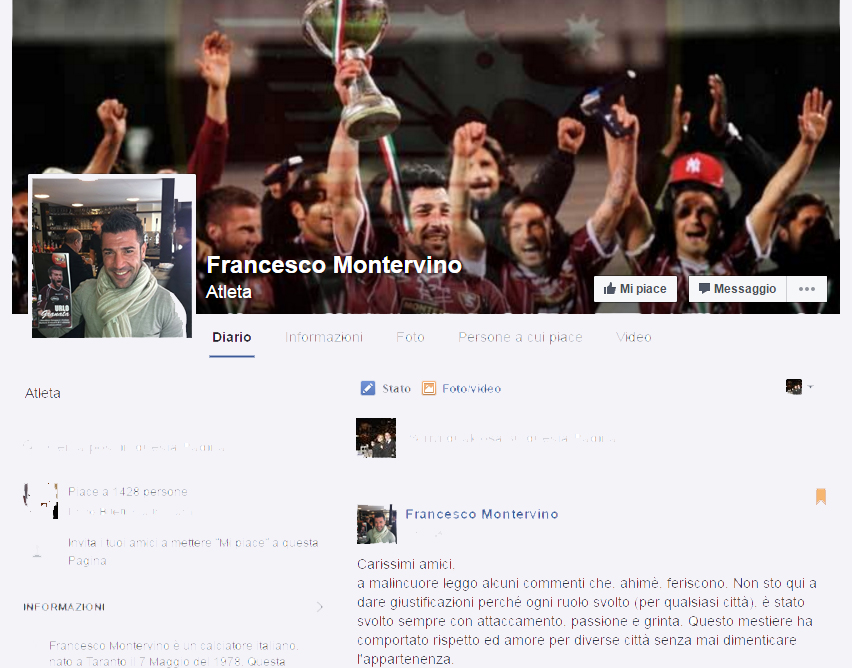 L’ex direttore sportivo del Taranto Fc 1927 Francesco Montervino ha denunciato alla Polizia postale un falso profilo Facebook. L’ex calciatore di Napoli, Ancona e Salernitana ha avuto problemi con la tifoseria tarantina dopo che è stata pubblicata sul social network, in un profilo risultato falso, una foto con gli auguri per la permanenza ottenuta sul campo dai granata di Leonardo Menichini. La rivalità con la squadra campana ha scatenato la reazione dei supporter del Taranto, che hanno espresso il proprio disappunto con delle scritte offensive nei confronti di Montervino comparse sui muri di recinzione dello stadio “Erasmo Iacovone”. “Ci tengo a sottolineare – ha riferito Montervino al sito di informazione sportiva Blunote – che non ho mai avuto un profilo Facebook e non mi sorprenderei, dopo la denuncia che ho appena depositato alla Polizia postale, se si scoprisse che a crearlo sia stato uno dei tanti nemici che ha come unico scopo quello di screditarmi e mettermi in cattiva luce agli occhi dei tifosi del Taranto. Andrò fino in fondo a questa faccenda, denunciando anche chi ha offeso la mia onorabilità con quelle scritte”.